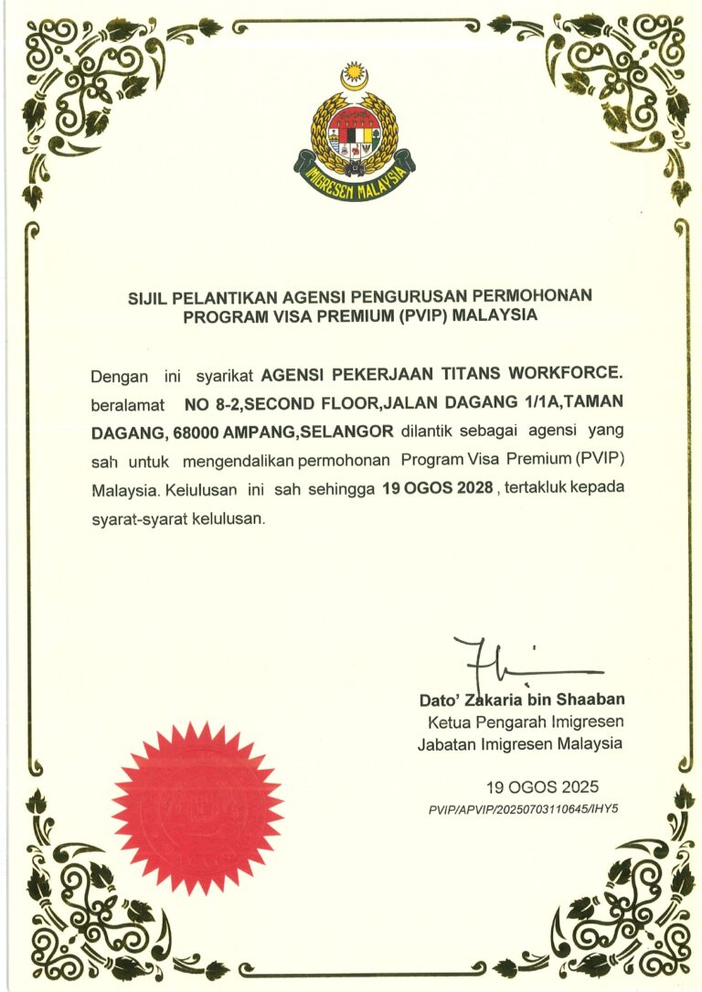 PVIPofficial.my is a professional service provided by Agensi Pekerjaan Titans Workforce Sdn Bhd. We are not an official government website. All applications are processed in accordance with, and subject to, the rules and approvals of the Malaysian authorities.